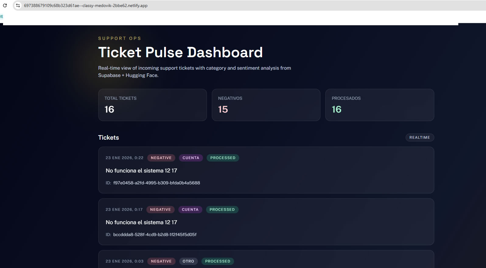 Production dashboard showing real-time ticket metrics and processed status, validating the frontend connection to Supabase.