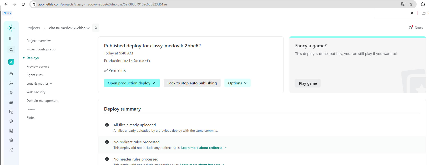 Netlify deployment summary shows the production deploy completed successfully, confirming the frontend build and publish pipeline is active.