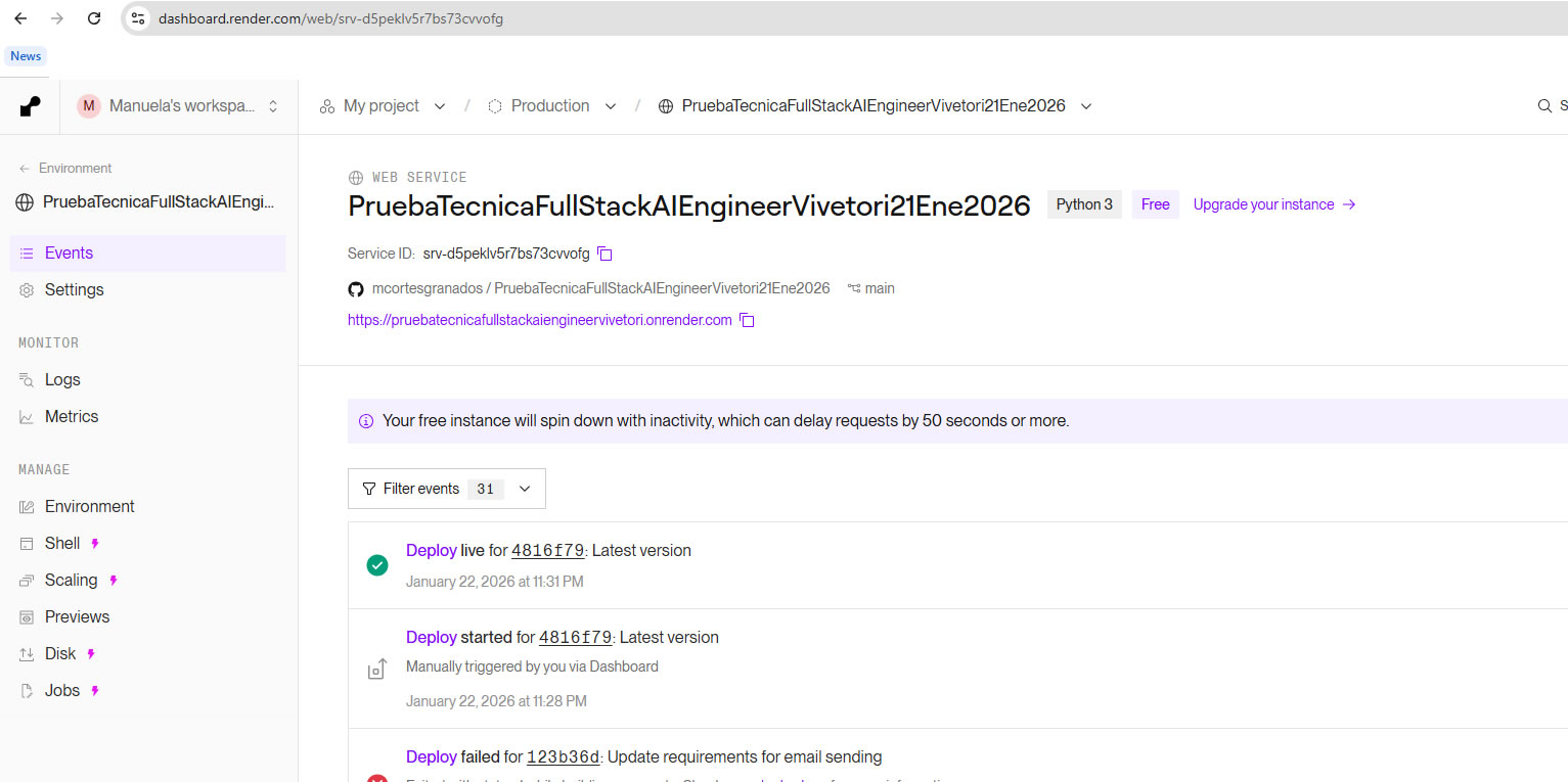 Render dashboard displays the web service and public URL for the FastAPI microservice, confirming live deployment.
