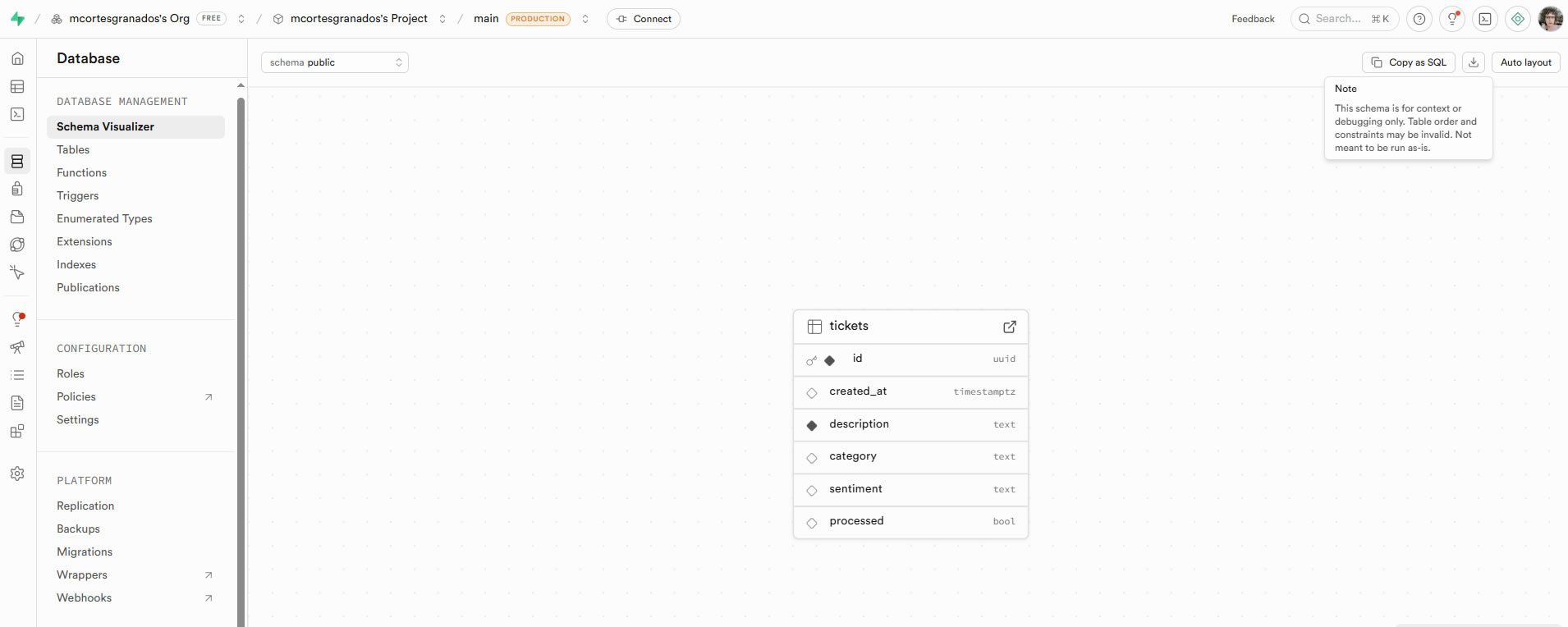 The Supabase schema visualizer confirms the tickets table structure used by the API and dashboard, including id, created_at, description, category, sentiment, and processed.