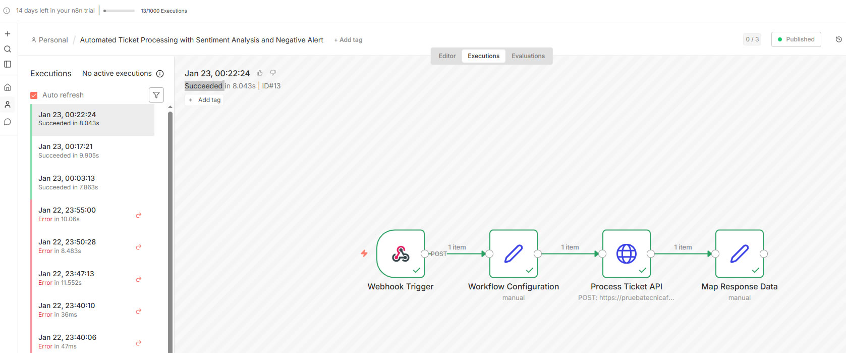 n8n workflow editor view showing the webhook trigger, ticket processing API call, and response mapping steps.